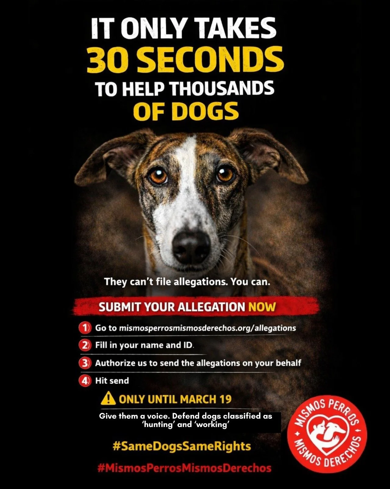 We stand with Mismos Perros, Mismos Derechos in supporting the campaign for equal legal rights for all dogs in Spain, including hunting dogs under animal welfare law.